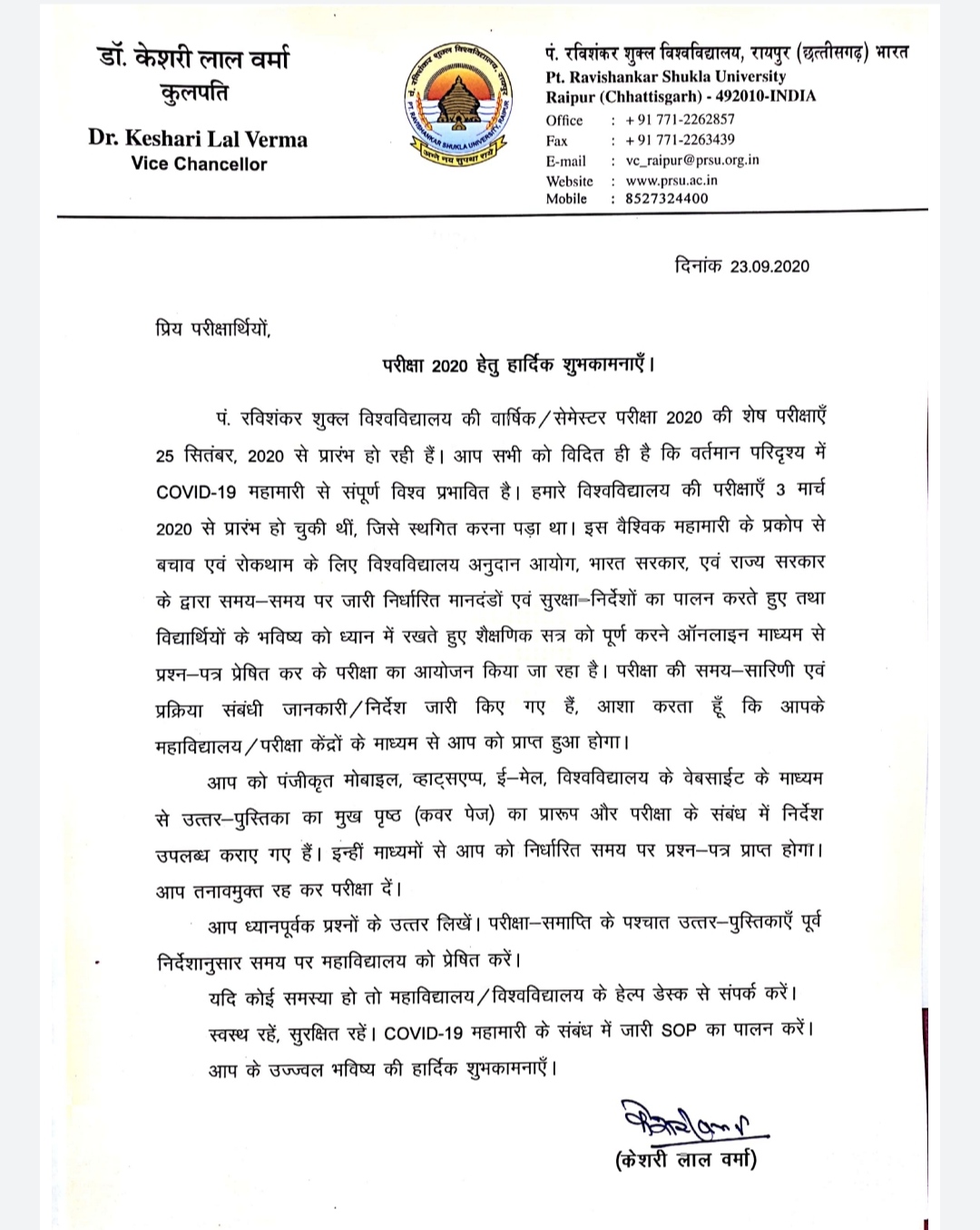 वार्षिक परीक्षा 2020 माननीय कुलसचिव का संदेश परीक्षार्थियों के नाम
