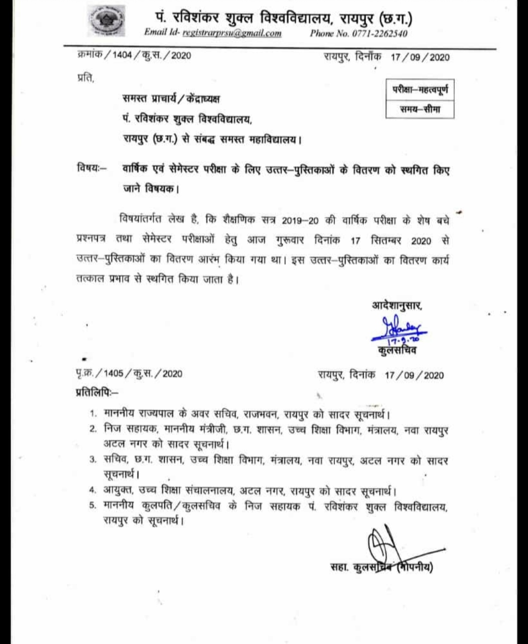 उत्तर पुस्तिका वितरण स्थगन सूचना वार्षिक परीक्षा 2020
